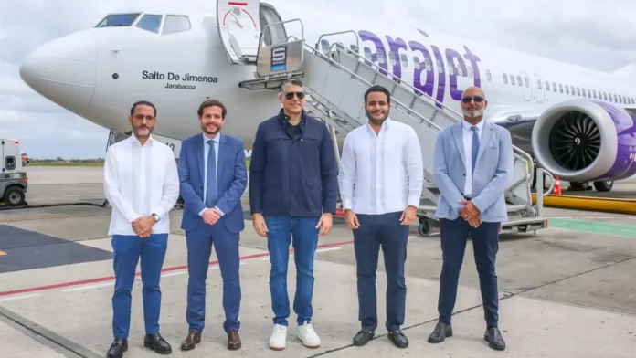 Santo Domingo.– La aerolínea bandera dominicana Arajet celebró hoy la llegada a la República Dominicana de su aeronave número 14, un moderno Boeing 737 MAX 8 bautizado como «Salto de Jimenoa» en honor a uno de los principales atractivos naturales de Jarabacoa, provincia La Vega.