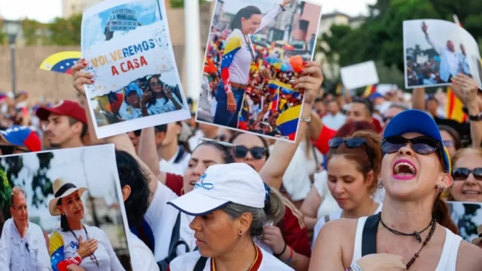 Madrid.- Miles de personas se concentraron desde primera hora de la tarde en el centro de Madrid para recibir a la líder opositora venezolana María Corina Machado, quien fue ovacionada con gritos de “¡Presidenta!” tras recibir la Medalla de Oro del Gobierno regional madrileño.